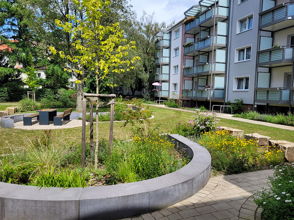 Im Zuge der Gebäudesanierungen mit Vorstellbalkonen mussten vorhandene Innenhöfe für die Feuerwehr befahrbar gemacht werden. Die Umgestaltung sah vor, neben der erforderlichen Funktionalität neue Räume für die BewohnerInnen zu schaffen. Bestandsbäume bleiben erhalten und werden unterpflanzt, üppige Staudenbeete mit Solitärsträuchern werten die Höhe auf. Schattige Sitzmöglichkeiten in Form von Mäuerchen oder Tisch-Bank-Kombinationen runden das Angebot ab.